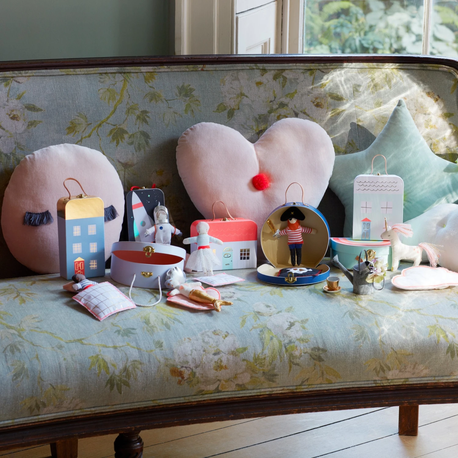 Little explorers will love to blast off to space with this amazing gift. Featuring a mini suitcase, beautifully illustrated with a spaceship, with a cord handle and metal clasp. Inside is a brave cotton astronaut doll with a jet pack and leatherette helmet. This sensational set is perfect to take on travels or for imaginative play at home.