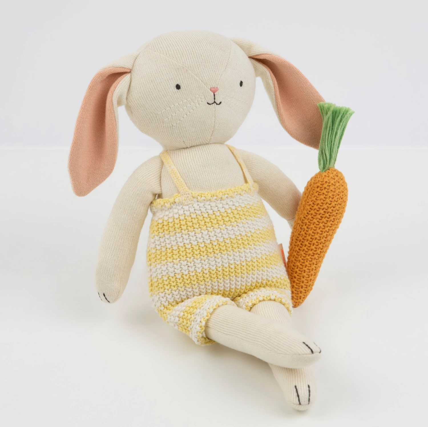 Meet Honey the bunny, a quality knitted toy crafted from soft organic cotton. Honey is dressed in an adorable crochet romper and is clutching a crochet carrot. A fabulous Easter gift or toy for imaginative play, it’s the perfect little friend for children of all ages.