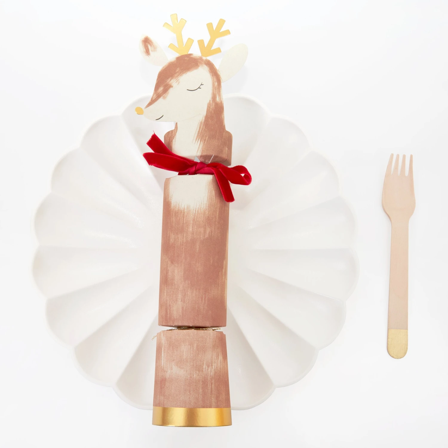 If you’re looking for beautiful, traditional cracker designs, then you’ll love these. They feature a happy Santa and a sweetly smiling reindeer, beautifully embellished with velvet ribbons and gold foil detail. Each contains a small gift, a hat and a joke.