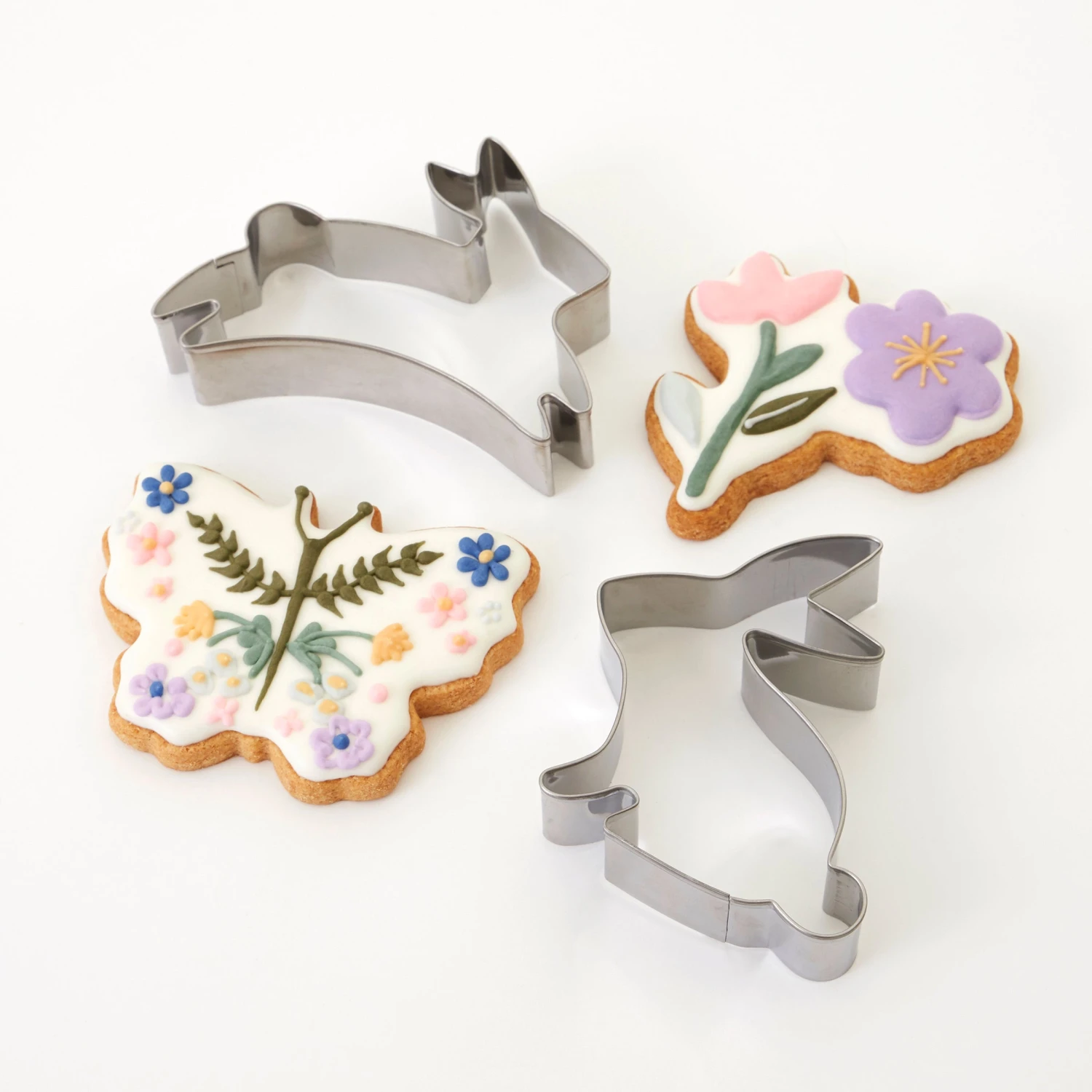 Create the most charming Easter cookies with this fabulous set of a leaping bunny, sitting bunny, flowers and a butterfly. Kids will love to help you cut out the cookies (not to mention decorate them once baked, and then eat them!)