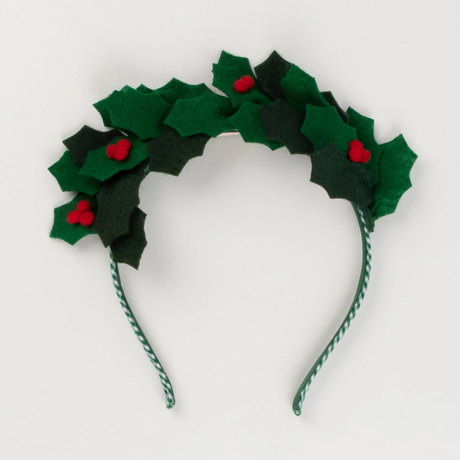 This headband is topped with soft green felt leaves and bright red pompom berries, perfect to wear to Christmas parties or for imaginative dress up. The headband is wrapped with green gingham ribbon for a stylish effect. The ideal hair accessory to instantly make you look and feel festive.