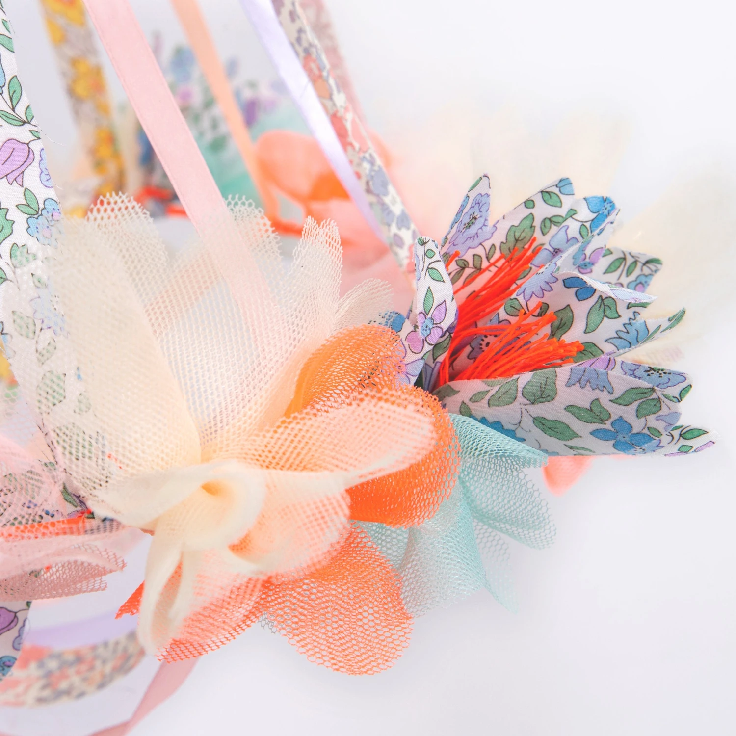 This beautiful Floral Fabric chandelier will add a gorgeous decorative touch to any room. Perfect as a year-round decoration, or ideal for a fairy or princess party. The flowers are crafted from Liberty fabric and tulle, in blue, mint, coral, peach and yellow. The chandelier is draped and looped with colorful ribbons, and streamers in a Liberty fabric too. Comes presented in a fabulous organza bag finished with a ribbon.