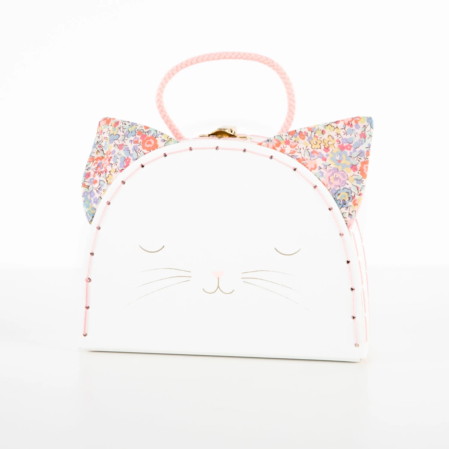 Little people who love mini suitcases and adore cats will be absolutely delighted with this sensational set! It’s perfect to play with at home or take on adventures. Featuring a mini suitcase crafted from stitched, laminated card with sweet cat features and Liberty fabric ears. Inside is a beautiful little kitty doll, crafted from cotton with a Liberty fabric dress and a quilt and pillow to snuggle up with.