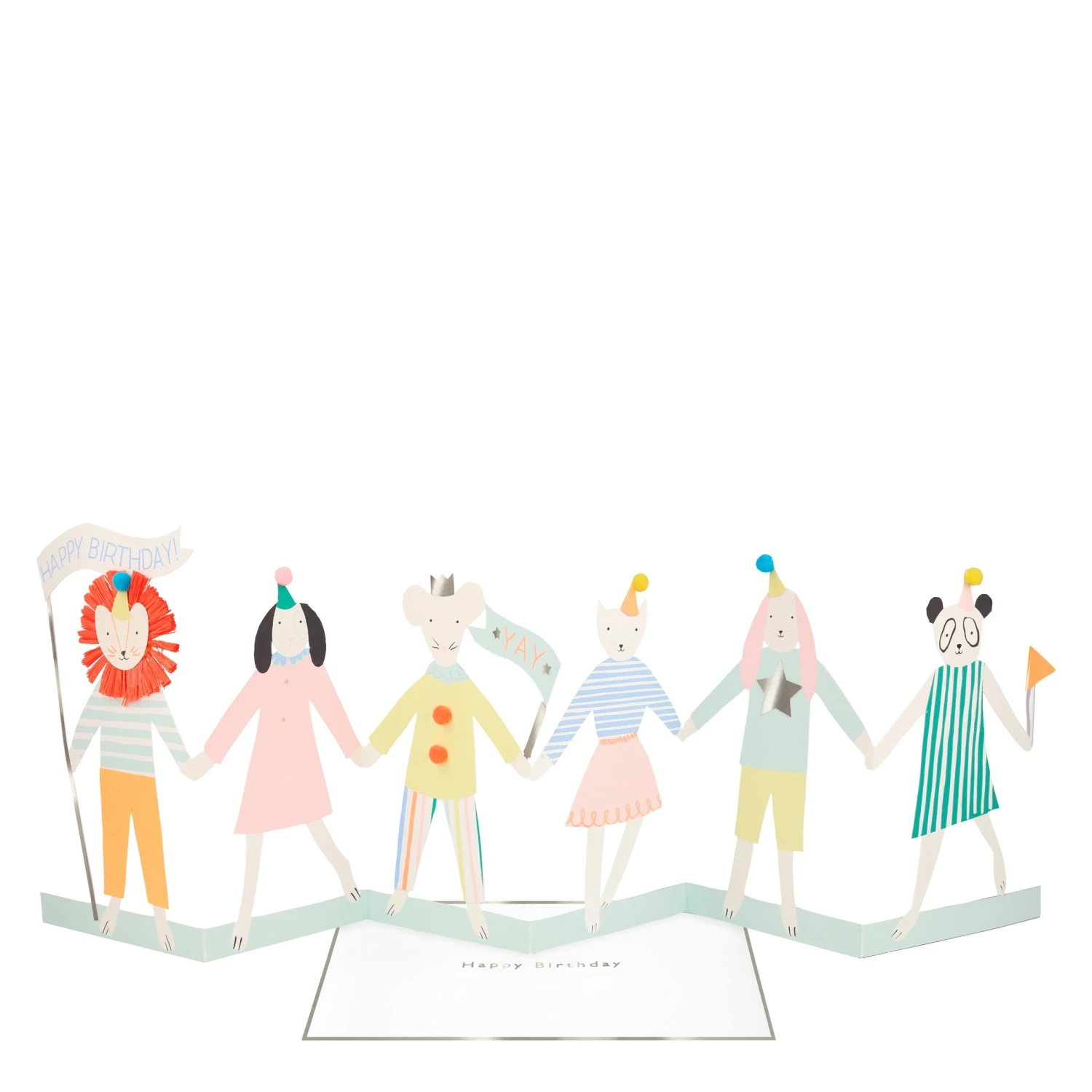 This is the most fabulous birthday card to send to an animal lover. It folds out to reveal adorable animals with pompom topped party hats and birthday flags proclaiming “Happy Birthday” and “Yay”. You’ll also love the lion with his fantastic raffia mane.