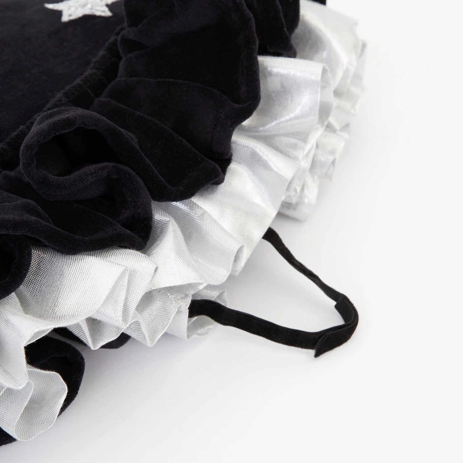 This witch’s hat, with ruffle details, is very stylish indeed. It is crafted from black velvet, with silver lamé and silver glitter stars and moons. An essential accessory for Halloween, or to add to a dressing up box for imaginative play any time of the year.